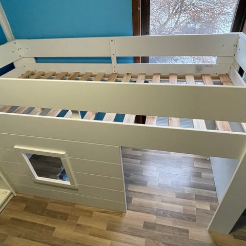 Vit loftsäng från IKEA. Säljes i befintligt skick. Finns ett märke i själva skrivbordsskivan. Madrass i använt skick och skickas med som extra i köpet.