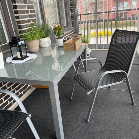 Två Rektangulära utomhusbord i nätt design, perfekt till balkongen eller uteplatsen. Borden tål väder och vind då dom är tillverkat i pulverlackerad stål. Har stått på en inglasad balkong, där med inte blivit utsatt för något regn eller dylikt. Bordet är mattsvart och kan skjutas ihop för att ta minimalt med plats när de inte används.