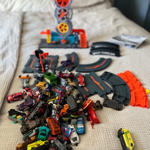 Uppskattningsvis minst 250 bilar max 350st. Många bra skick och coola. Andra använda och lekta med. Inte dubletter. Följer med en lastbil dragrace bana och ett hopp.