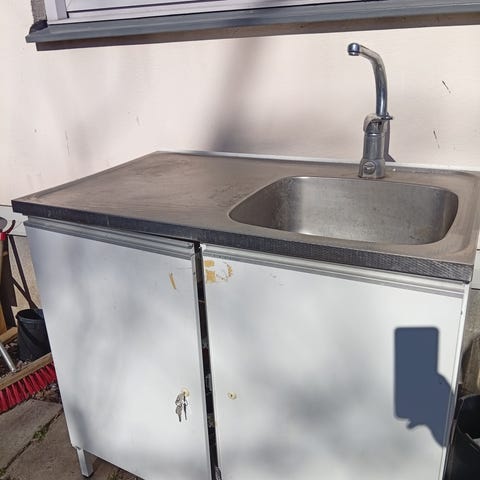 Köksskåp med lång vit bänkskiva och infälld dubbel diskho i rostfritt stål. Diskhon har två lika stora hoar samt avrinningsyta och blandare monterad i bänkskivan. Underdelen består av vita skåp och lådmoduler. Passar som komplett köksbänk eller arbetsyta i kök, tvättstuga eller liknande utrymme. Från Ballingslöv.