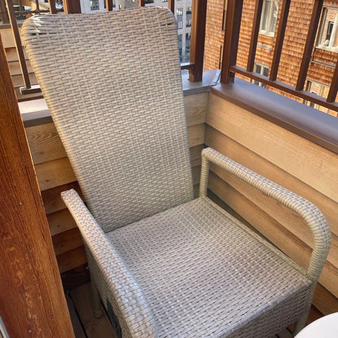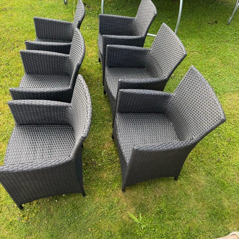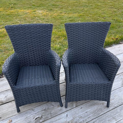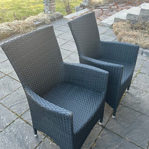 Två trädgårdsfåtöljer i svart konstrotting. Stolarna har raka armstöd och hög rygg, anpassade för utomhusbruk på altan, balkong eller i trädgård. Konstrottingen är flätad och lätt att rengöra. Säljs som sittmöbler för uteplats.