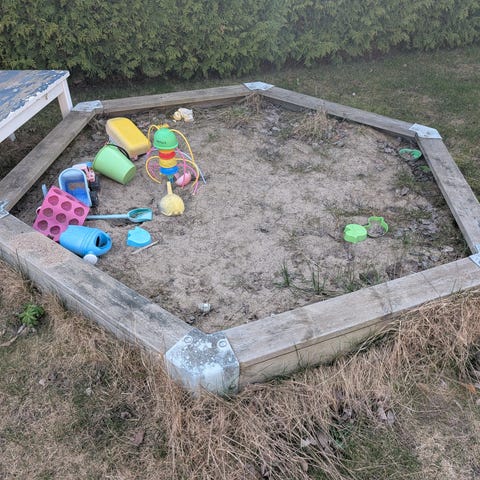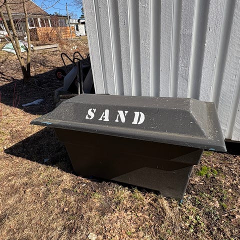 En grön sandlåda i plast för förvaring av sand, grus eller annat materia säljesl. Lådan är utrustad med lock och upphöjda ben.