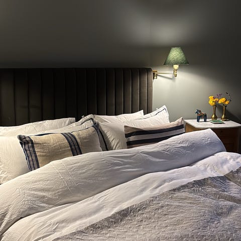 Fristående gavel klädd med sammet och djuphäftade klädda knappar.