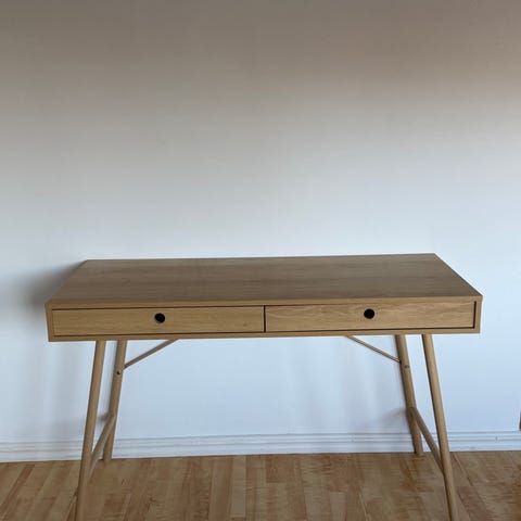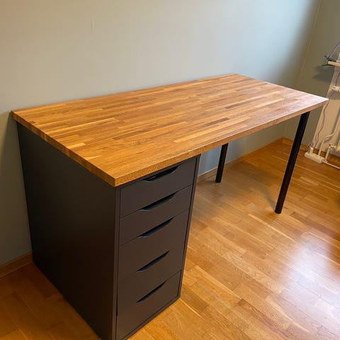Skrivbordet har två praktiska lådor med bra förvaring och gott om arbetsyta. Stabilt och i bra skick.