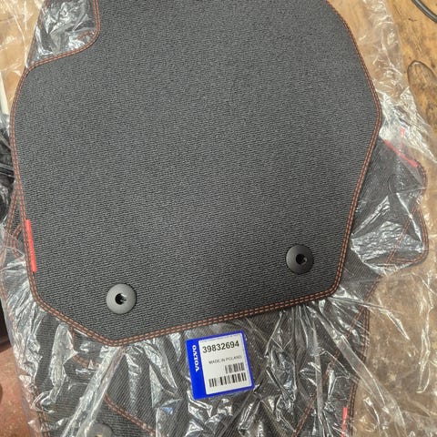 Svarta bilmattor i textilmaterial. Uppsättning med fyra mattor anpassade för fram- och baksäte. Mattorna har fästhål för montering i bilens golv där sådana finns. Passar som golvskydd i kupén och hjälper till att samla upp smuts och fukt.