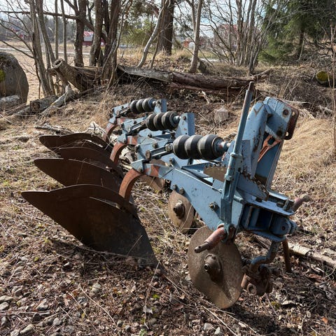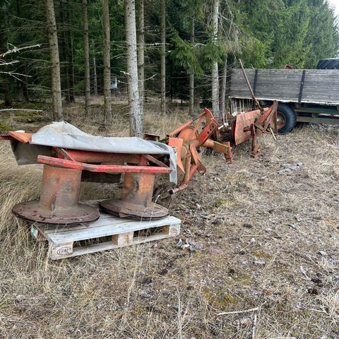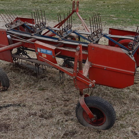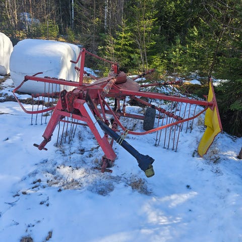 Vändnin av hö och strängläggning av gräs och vall och kopplas bakom traktor. Utrustad med hjul och mekaniska armar med pinnar för att lyfta och lägga grödan. Passar för lantbruk eller arbete på åkermark och betesmark där mekanisk slåtter önskas. Maskinen förvaras utomhus och visar tecken på användning och ålder. Nya däck