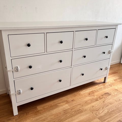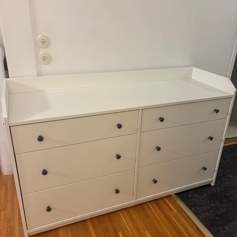 Säljer en vit byrå med 6 lådor från Ikea, märke HAUGA.