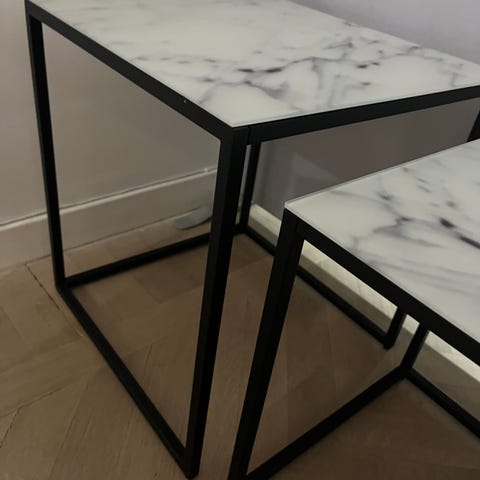 Säljer ett fint sidobord men toppskiva av riktig mormor. Stativ i svart metall.