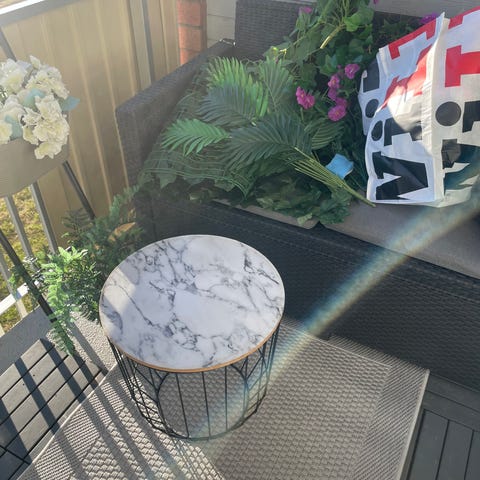 Matgrupp runt matbord med marmorskiva och gröna sammetsstolar