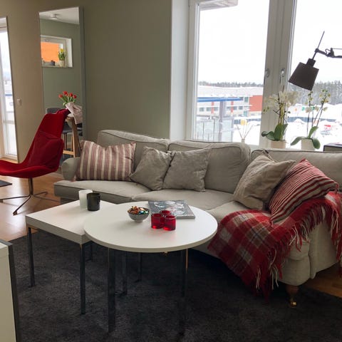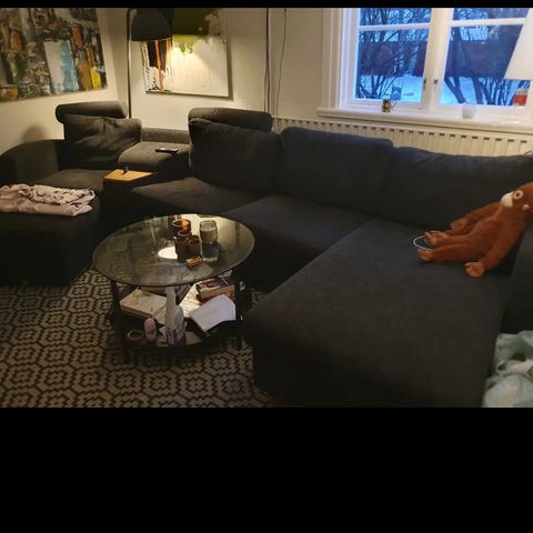 Klädseln till dynor och kuddar avtag- och tvättbar. Fläckar förekommer på övrig klädsel. Hund har funnits i hemmet.