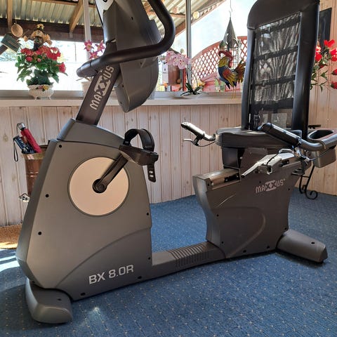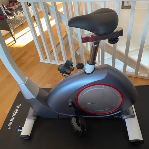 Star Trac motionscykel med inbyggd träningsdator. Utrustad med digital display som visar bland annat tid, watt och kalorier samt knappar för att ställa in motstånd och program. Justerbar sadel och fasta handtag framtill. Avsedd för inomhusträning och konditionsträning.