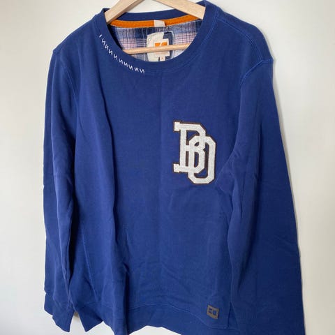 Lexington sweatshirt i marinblå med ikonisk "L"-patch i guld/orange. College-inspirerad stil. Mjuk bomullskvalitet.