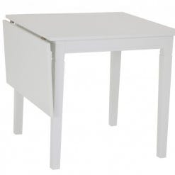 Matgrupp från Mio. Vitt klaffbord av modell Maja med 4 vita trästolar av modell Moa. Grönrandiga dynor till stolarna är inkluderade.