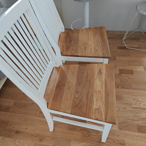 Säljer två vita matstolar med träsits. Stabil och klassisk design som passar de flesta hem.