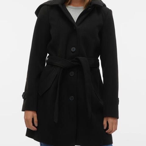 Mango kappa för dam i storlek XS. Ytterplagg i svart färg, tillverkad i ull. Modellen har knytskärp i midjan och lång ärm, lämplig som ytterkläder vid svalare väder.