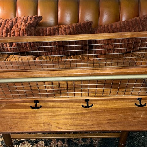Klädhängare med integrerad bänk i trä och metall. Övre delen har två horisontella träpaneler med flera krokar för upphängning av jackor, väskor och accessoarer. Den nedre delen består av en sittbänk i trä och ett metallgaller undertill som kan användas som skohylla eller förvaring. Passar i hall eller entré för praktisk förvaring och sittplats vid på- och avklädning.