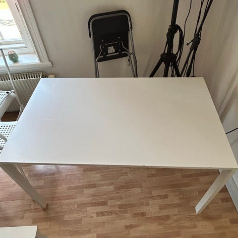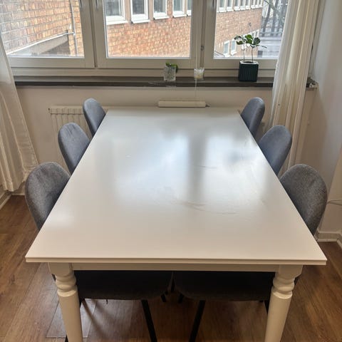 Vitt matbord som är relativt slitet, men fullt funktionellt. 6 st gråa fina mjuka matstolar från Jysk.