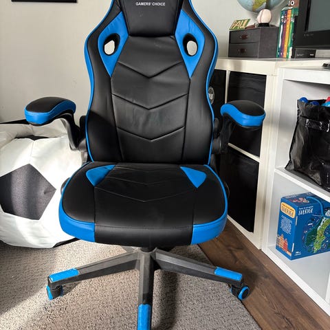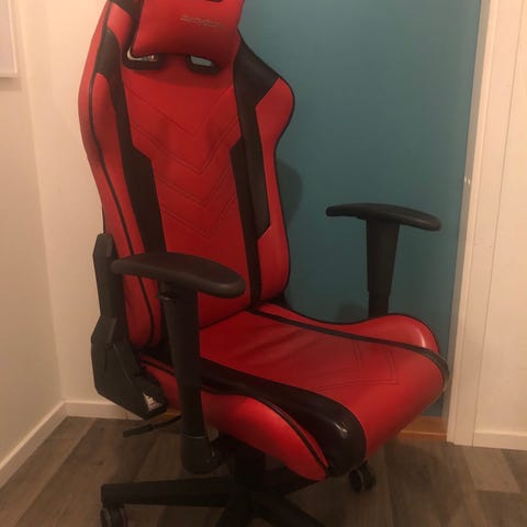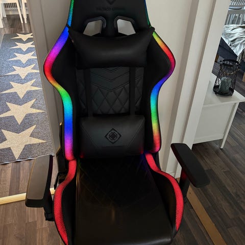 Piranha gamingstol med LED-belysning i svart konstläder. Stolen har hög rygg med integrerat nackstöd och sidostöd, samt justerbara armstöd. LED-lister löper längs sits och ryggstöd och kan lysa i olika färger. Sitsen är vadderad och utformad för att ge stöd vid längre sittperioder, exempelvis vid datoranvändning eller spel. Stolen står på ett femhjuligt kryssben för rörlighet på golvet.