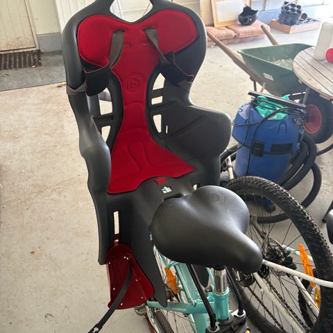 Hamax cykelsits för barn. Sitsen är svart med röd innersits och har justerbara fotstöd, fotremmar och trepunktssele. Monteras bakom sadeln på pakethållare eller ram beroende på cykeltyp och medföljande fäste.