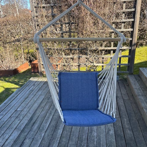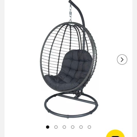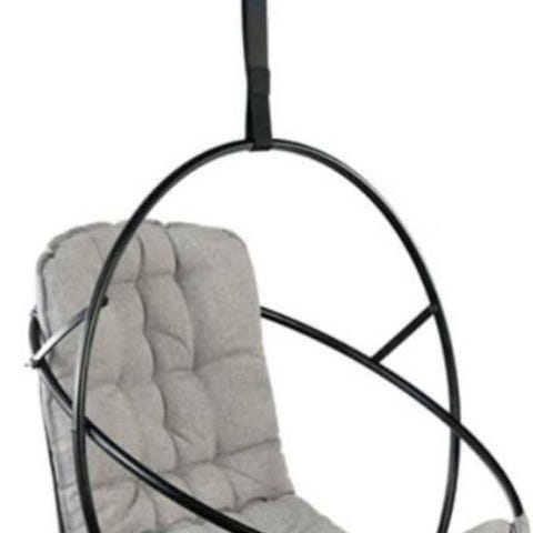 Äggformad hängstol med stativ i metall och flätad rottingliknande konstruktion. Stolen har gråa dynor med sittdyna, ryggdyna och nackkudde för ökad komfort. Mått på korgen är cirka 108 cm i höjd och 93 cm i bredd, totalhöjd med stativ är cirka 201 cm. Passar för användning inomhus eller på uteplats, balkong eller altan beroende på materialets väderbeständighet.