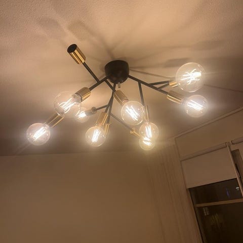Vår fina taklampa söker nytt hem då den tyvärr inte passar hos oss längre. Den ger ett varmt och stämningsfullt ljus, extra fin när den är dimrad.