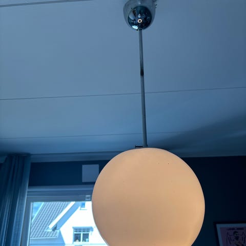 Fin klassisk taklampa med klot i glas och silverfärgad upphängning. Finns något mindre märke (se bild) men annars i ett fint skick.