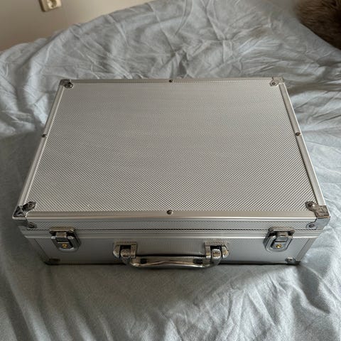 Silver case. Mått - L 105, B 35, H 24. Bra skick. Pris 400:-