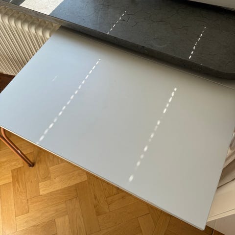 Skicket är bra men inte nytt – det finns några mindre repor och bordet är lite dammigt/smutsigt på bilden
