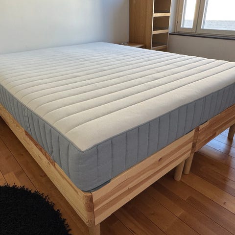 BORTSKÄNKES. Kontinentalsäng SÄBÖVIK från IKEA. Ett hål sågat på ena sidan, benet i mitten är vingligt och sänggaveln är avsågad men den är i fullt användbart skick. Nästan helt ny bäddmadrass från Jysk medföljer. Har monterat isär sängen för enklare förflyttning. Bortskänkes pga flytt.