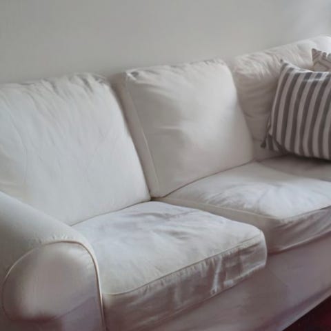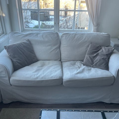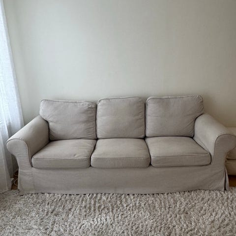 Soffa Ektorp 3-sits i beige tyg, original från IKEA. Kan hämtas den 17:e, 18:e eller 19:e april. Efter det slänger vi den