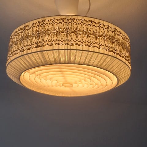 40 cm bred . Hel och fin . Allt funkar. Två raster som fördelar ljuset fint. Textil med broderat blommigt mönster .