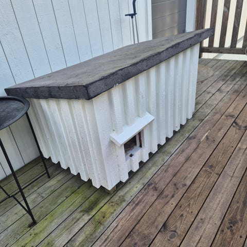 Katthuset i trä, målat i blått med vita detaljer. Huset har en liten ramp upp till ingången samt en takterrass med räcke. Passar för mindre husdjur som katt eller liten hund och kan användas utomhus i trädgård eller på tomt. Huset är isolerat.