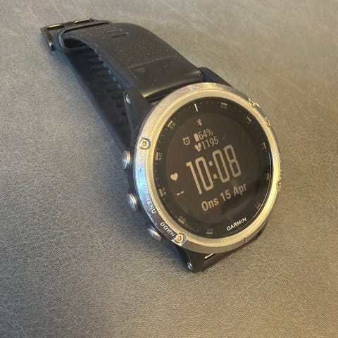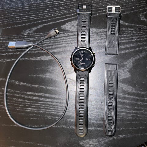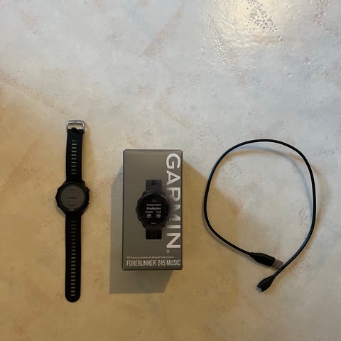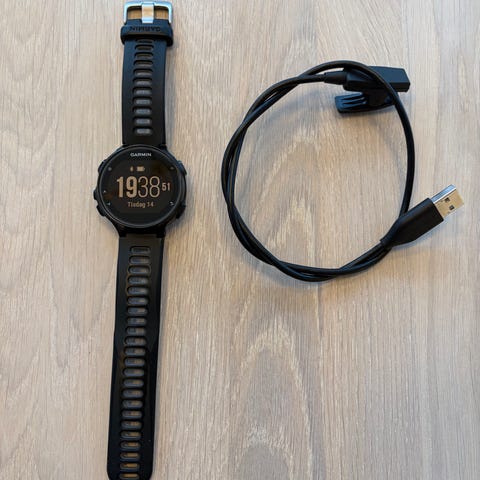 Garmin Forerunner 735 med laddsladd USB-kabel. På bilderna syns även ett pulsband med sensor som kan användas tillsammans med klockan för pulsmätning vid träning.