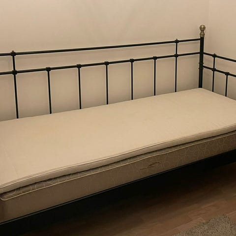 Säljer en dagbädd, Meldal, bäddmått 90x200cm. Sängen är i fint skick (nu nermonterad), madrasserna är delvis fläckiga men luktfria (sängen har använts av ung tonåring, så det är mest troligt vätskor som spillts, typ te/läsk el dyl, alltså ingen sängvätning) 3 madrasser ingår; resårbotten samt 2 lite tjockare bäddmadrasser (en med memoryfoam).