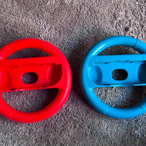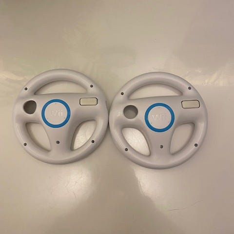 Nintendo Wii ratt i vit plast. Ratten är utformad för att hålla en Wii-fjärrkontroll i mitten och används som tillbehör till bil- och racingspel på Nintendo Wii-konsol. Baksidan har fack för kontrollen samt öppningar för knappar och sensorer så att funktionerna på Wii-fjärrkontrollen kan användas under spel.