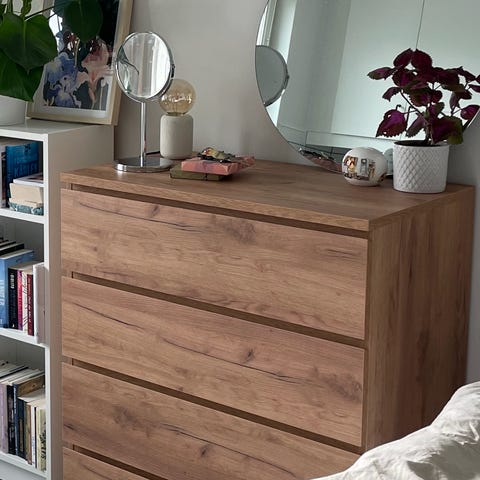 Tromsö byrå(modellen heter numera Story) i kritvit lackerad mdf med knoppar i metall. I de tre lådor som är på byrån får du gott om plats för förvaring.
