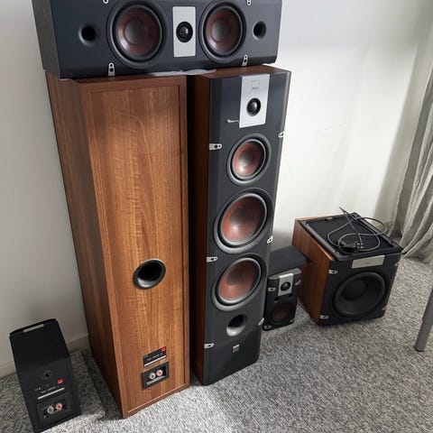 Alla högtalarna är i gott skick. Alla har väggfäste. En har lite vit färg på själva väggfästet, syns nästan inte.