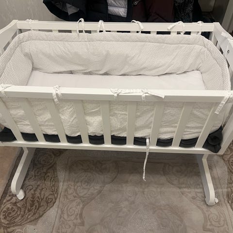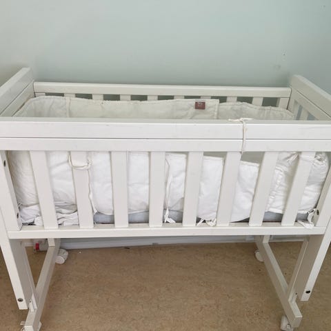 Troll bedside crib spjälsäng i vitlackat trä. Den står på ben med hjul för att kunna flyttas vid behov. Madrass och spjälsängskydd ingår.