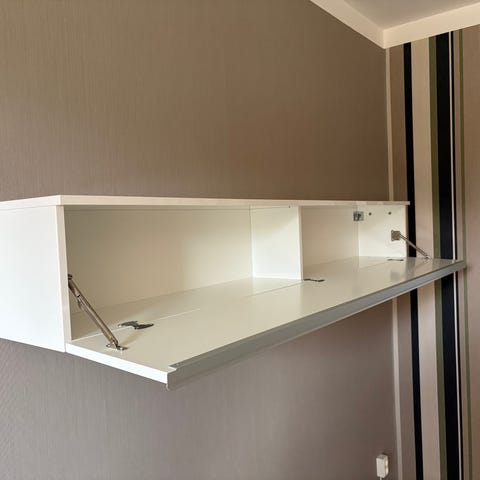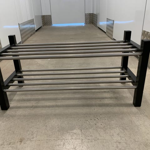 Tillverkat i lackerad skivmaterial med handtag på varje lucka och låda. Passar för placering mot vägg i mindre utrymmen där man vill samla skor och småsaker på en begränsad yta.