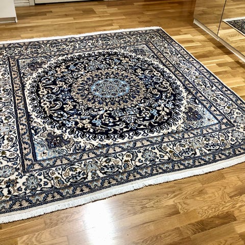 En otroligt vacker äkta persisk Nain matta med måtten 195x293 cm. Växtdekor med blå botten.