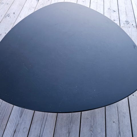 Runt soffbord med marmormönstrad skiva och svart metallunderrede