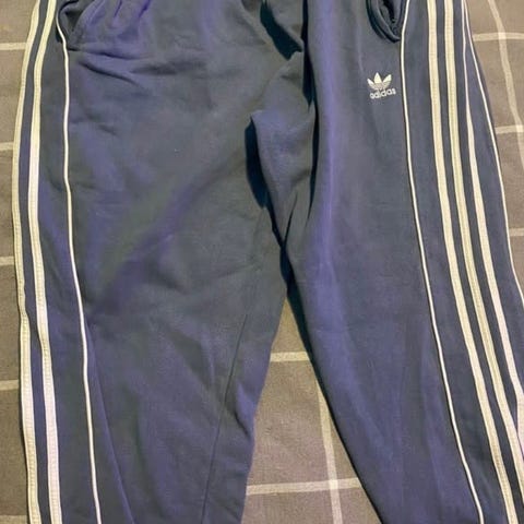 Adidas by Gucci träningsbyxor för herr i storlek M. Byxorna är blå med mönster och har de karakteristiska tre ränderna längs sidorna. Modellen har resår i midjan, dragkedjefickor framtill och rak passform. Passar för vardagsbruk eller lättare träning.
