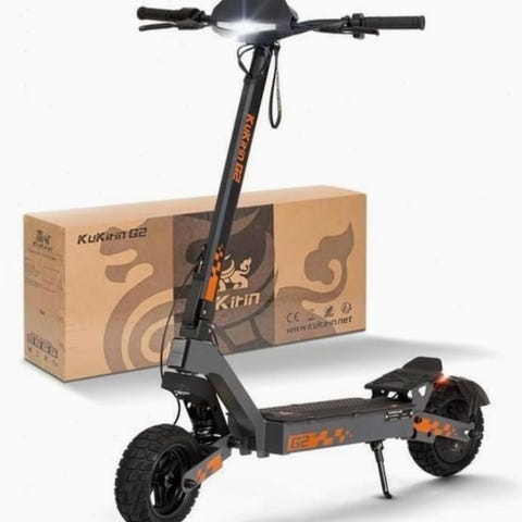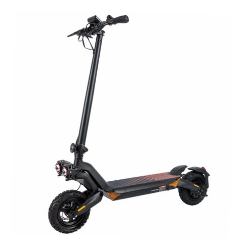 Elscooter i svart färg med bred ståplatta och stora hjul. Utrustad med styre med handtag, bromshandtag och display/enhet vid styret. Passar för persontransport på kortare sträckor i urbana miljöer. Drivs av elmotor och har hopfällbar konstruktion för enklare förvaring och transport.
