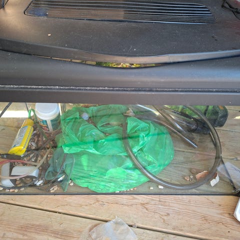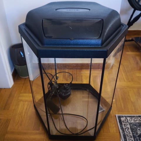 Akvarium med svart grus och täckglas plus ljus ramp. 60L snabb uphämtning prioriteras.