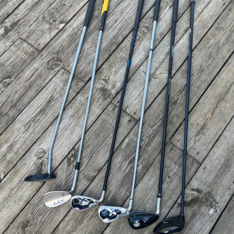Cleveland golfklubbor. Setet består av flera klubbor med metallskaft och huvuden i metall, samt tillhörande headcovers med Cleveland-logotyp.