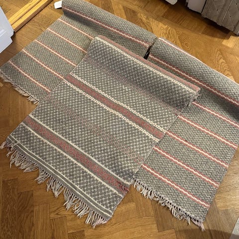 matta i ull i brun färg med ljusa ränder. Mattan är vävd med tydlig struktur och har fransar i kortsidorna. Passar exempelvis i hall, kök eller mindre rum. Materialet är ull, vilket ger en mjuk och varm känsla under fötterna. Rengörs enligt skötselråd på etiketten, i första hand genom dammsugning och fläckrengöring.