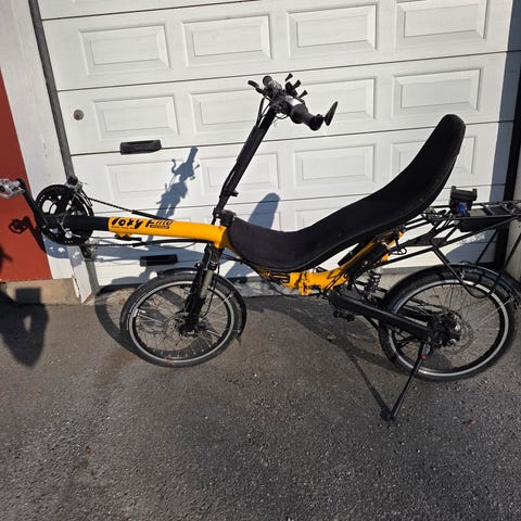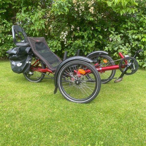 Greenspeed Liggcykel med två hjul fram och ett hjul bak - alla lika stora.