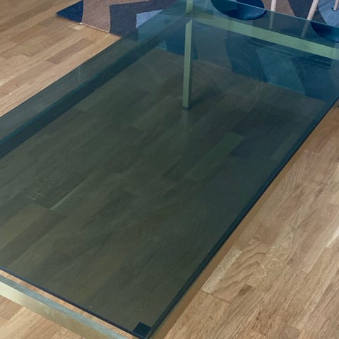 Det här soffbordet i modern stil känns igen på sin kombination av härdat glas, en hylla i granit eller stenliknande material och grå- eller silverfärgade metallben. Säljer på grund av flytt.