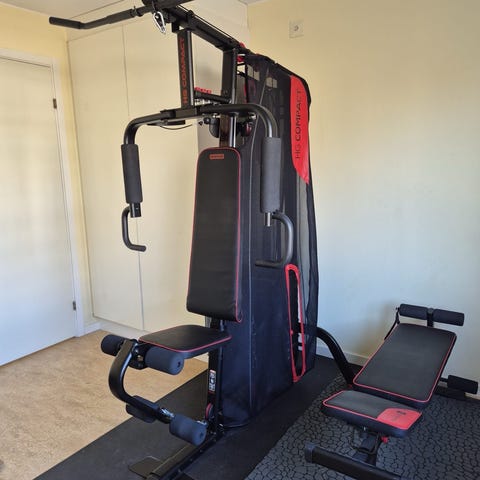 Weider hemmagym multigym i röd/silver färg. Träningsstation med viktmagasin och flera träningsmöjligheter för över- och underkropp, bland annat latsdrag, bröstpress och bencurl. Passar för styrketräning i hemmet med justerbara inställningar för olika övningar och användare.