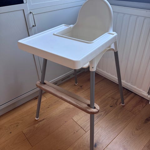 IKEA Antilop barnmatstol i vit plast med avtagbar bricka. Stolen har fyra ben i metall och är utformad för små barn som ska sitta vid matbordet. Sits och ryggstöd är i ett stycke för enkel rengöring. Passar som matstol i kök eller matplats.